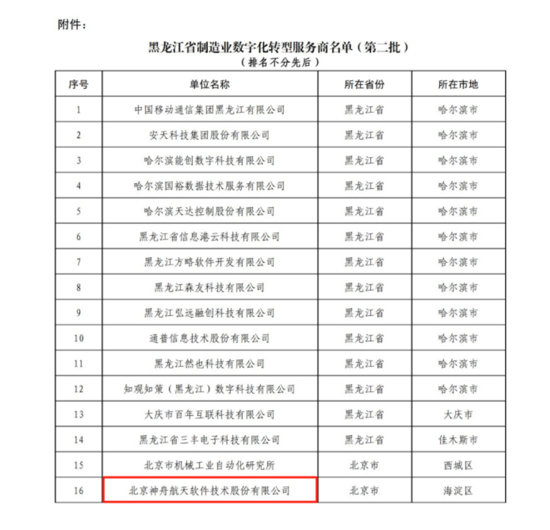 6月11日,黑龍江省工信廳公布了《黑龍江省制造業(yè)數(shù)字化轉(zhuǎn)型服務(wù)商名單(第二批)》,神軟公司名列其中。