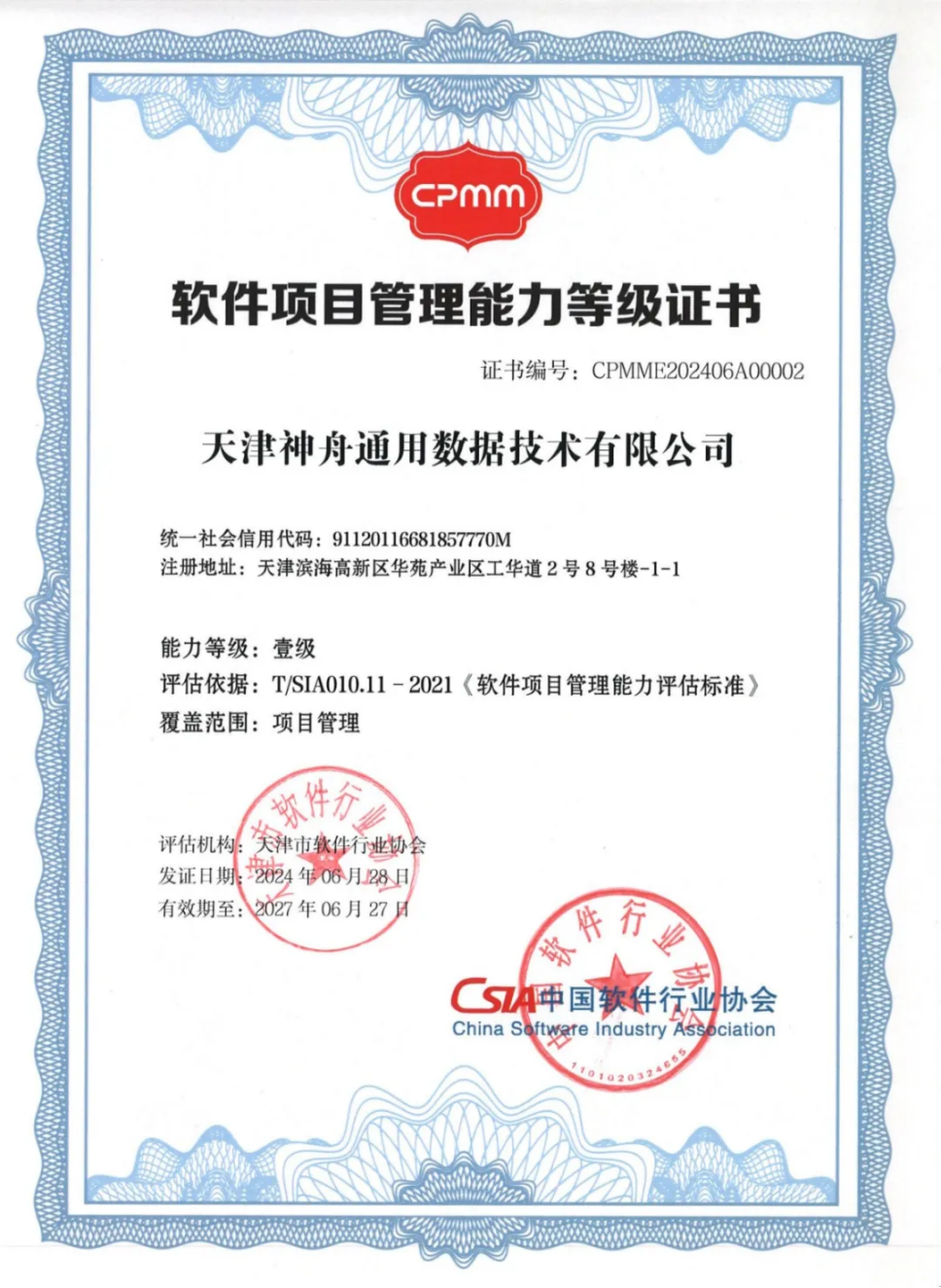 經(jīng)過天津市軟件行業(yè)協(xié)會的受理和初評,并由中國軟件行業(yè)協(xié)會組織的專家團(tuán)隊(duì)進(jìn)行嚴(yán)格評審,神軟公司子公司天津神舟通用數(shù)據(jù)技術(shù)有限公司憑借優(yōu)秀的項(xiàng)目管理能力,榮獲了軟件項(xiàng)目管理能力評估(CPMM)一級證書。