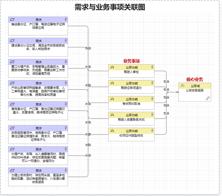 需求與業務事項關聯通過工具將重大需求關聯到核心業務及業務事項。定準核心業務是“V”模型應用的起點,從需求出發,謀劃多跨場景的第一步就是要找到場景所在的核心業務和事項,自此開始對業務進行多跨場景的拆解和集成。