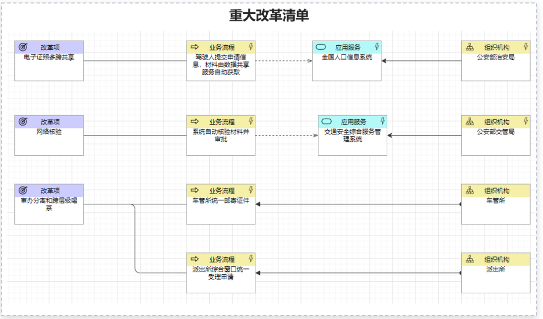 將再造流程中的創新點關聯到涉及的應用系統以及主管部門,即可形成完整的改革項,最終作為梳理重大改革清單的素材。